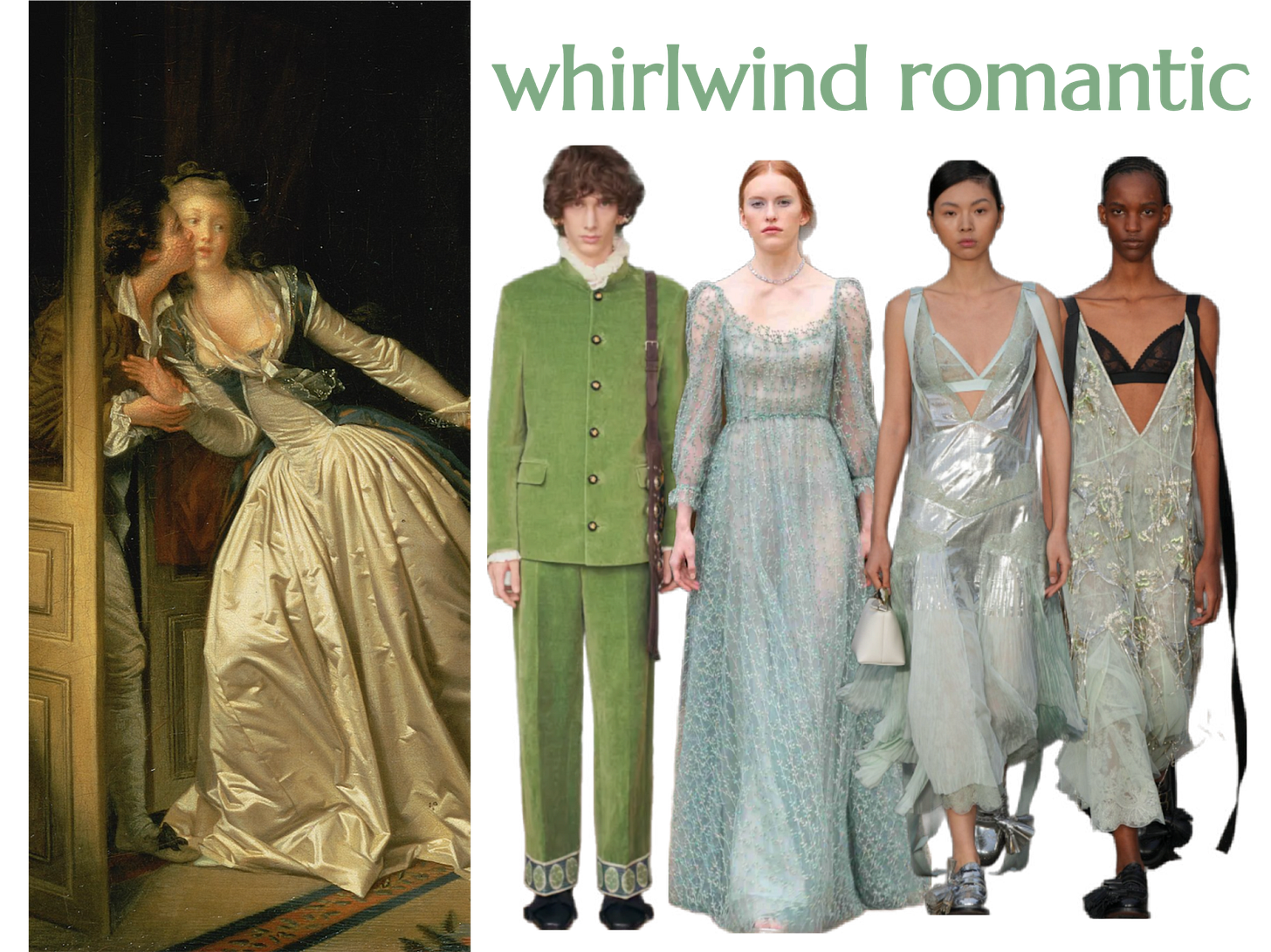 For stolen kisses, pretty lies: Since this painting is all about sensuality and different fabrics, I thought I’d vary the textures and transparency. We’ve got Valentino with the green suit and ruffle collar to match the male kisser. Luisa Beccaria has romance down with a sweeping, semi-transparent gown. Finally, Erdem with slinky nightwear, to evoke temptation, decadence, and a state of undress.