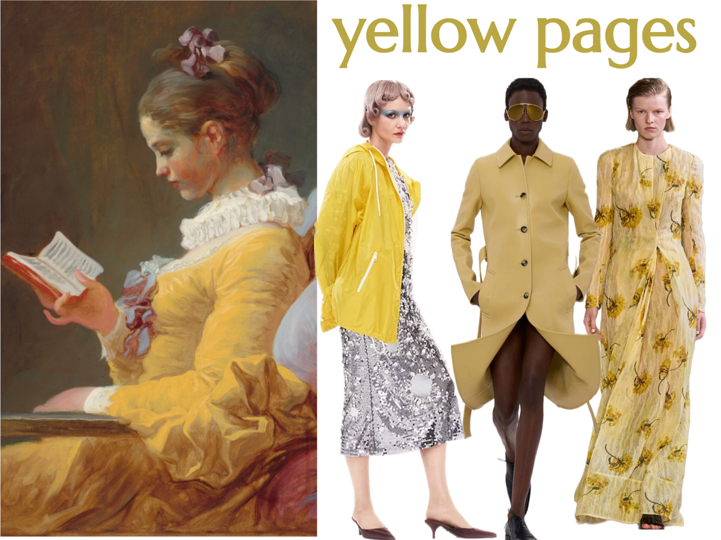 For buttery bibliophiles: These outfits align with the color and sleeves of the reader (I tried my hardest to find some with a ruffled collar, but alas). Butter yellow has been coming back for a while now,4 so it’s nice to see options beyond the ever-present mustard. I wanted to point out that like Fragonard’s painting, the first look has some literary chops: author Ottessa Moshfegh wrote 10 short stories for Carey Mulligan’s Prada campaign, and each look was inspired by them.
